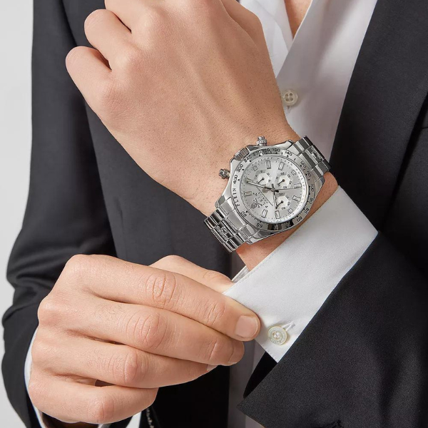 Šifra: 26685 Pol: Muški Tip mašine: Quartz Staklo: Hardened Mineral Glass Prečnik kućišta: 43mm Boja narukvice: Srebrna Vodootpornost: 5ATM Garancija: 2 godine