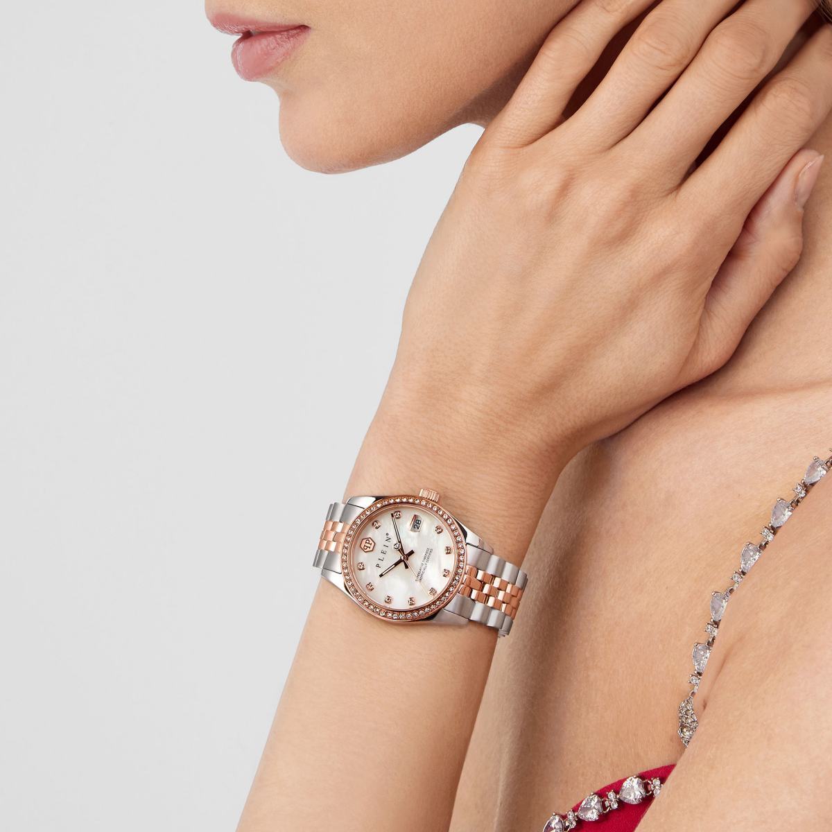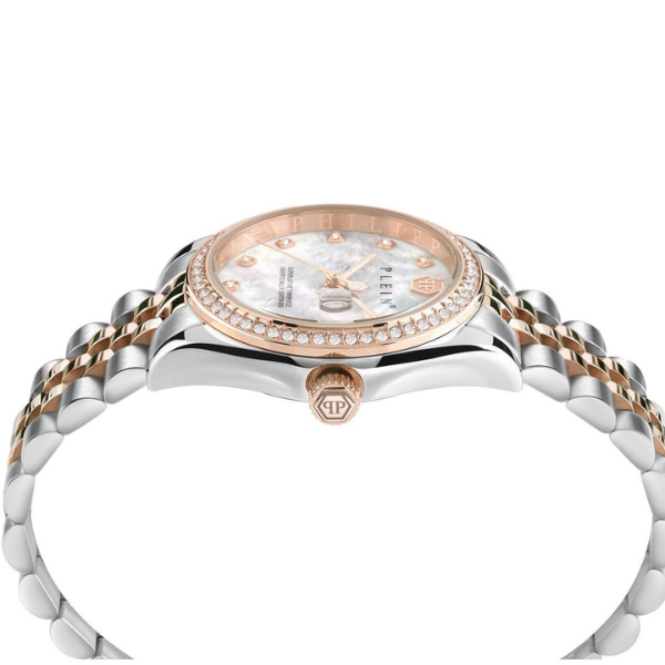 Šifra: 27338 Pol: Ženski Tip mašine: Quartz Staklo: Hardened mineral glass Prečnik kućišta: 34mm Boja narukvice: Bicolor Vodootpornost: 5ATM Garancija: 2 godine