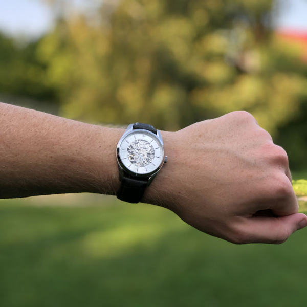Šifra: 41825 Pol: Unisex Tip mašine: Automatic Staklo: Safirno Prečnik kućišta: 38mm Boja cifera: Bijela Boja narukvice: Braon Vodootpornost: 10ATM Garancija: 2 godine