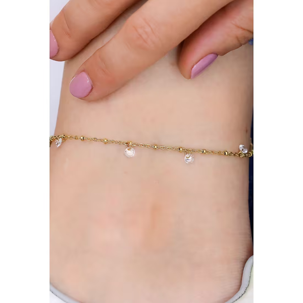 Šifra: 31334 Pol: Ženski Vrsta nakita: Nanogica Materijal: Nerđajući čelik Boja: Zlatna Dužina: 22 + 3 cm