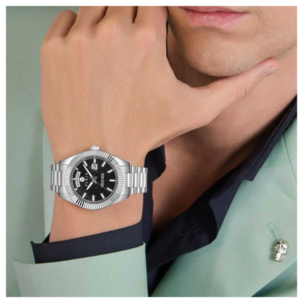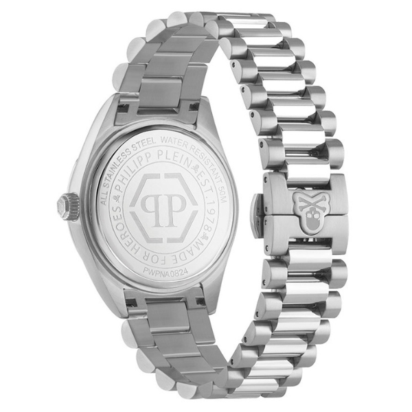 Šifra: 42242 Pol: Unisex Tip mašine: Quartz Staklo: Mineralno Prečnik kućišta: 42 mm Boja cifera: Crna Boja narukvice: Srebrna Vodootpornost: 5 ATM Garancija: 2 godine